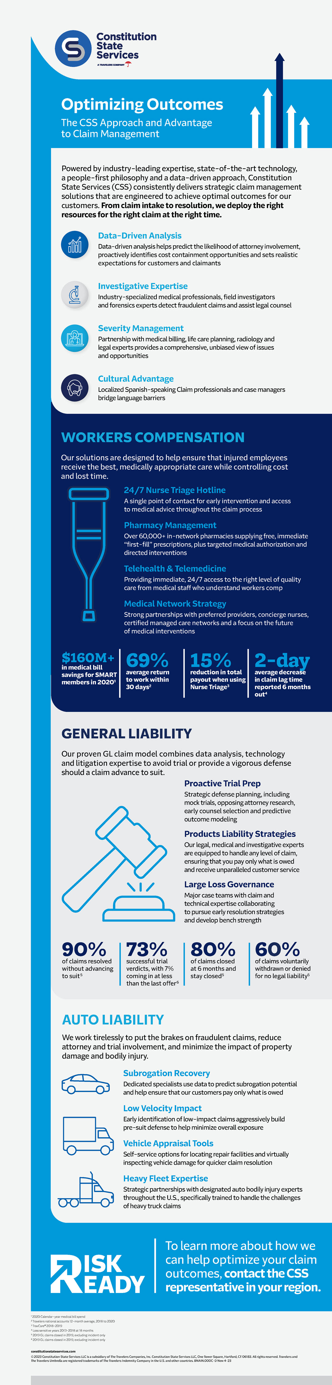 Powered by industry-leading expertise, state-of-the-art technology, a people-first philosophy and a data-driven approach, Constitution State Services (CSS) consistently delivers strategic claim management solutions that are engineered to achieve optimal outcomes for our customers. From claim intake to resolution, we deploy the right resources for the right claim at the right time.